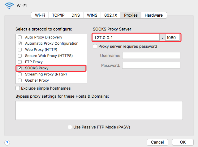 2.找到浏览器的代理配置部分, 选中SOCKS代理, 设置主机为127.0.0.1,端口为1080。如图6-2