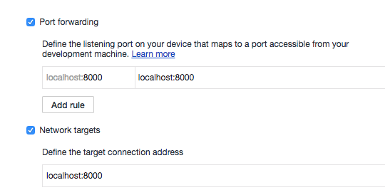 https://developers.google.com/web/tools/chrome-devtools/remote-debugging/ 本地运行的项目需要配置Port forwarding 和 Network targets, 如图1-1: